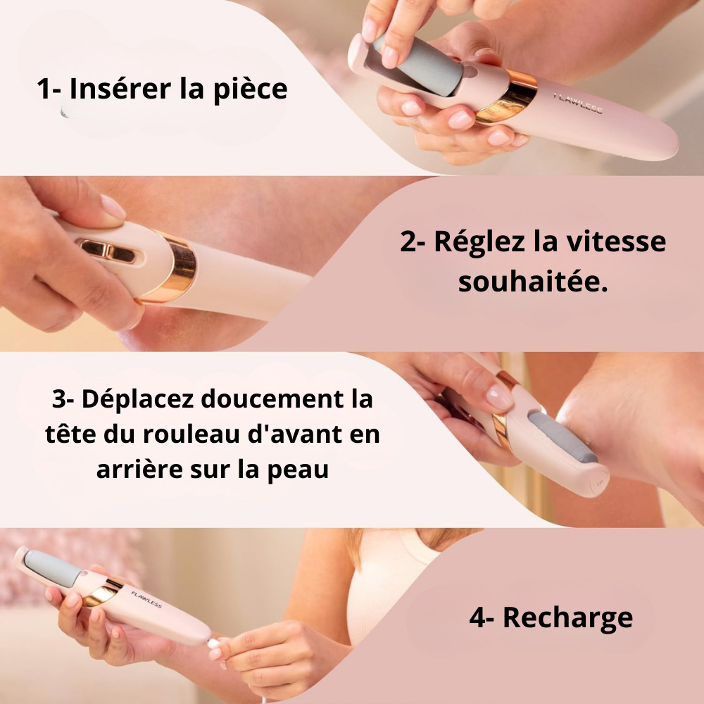 - L’appareil est équipé de rouleaux abrasifs qui tournent automatiquement lorsqu’on l’allume.